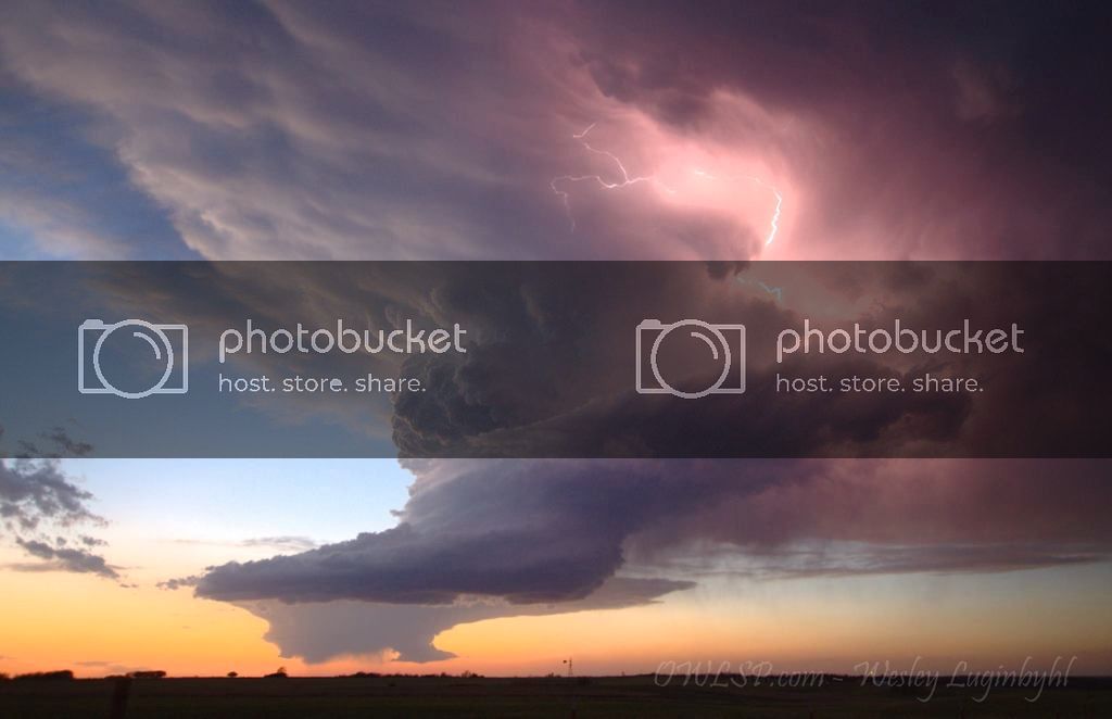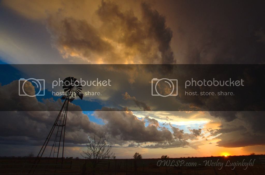 I traveled east into OK on 33 toward Crawford catching a nice "whale's mouth" as a storm turned outflow. As sunset approached, the storm I had been on previously had died and came back to life still SE of Canadian. I quickly backtracked down 33 catching these images along the way. It spit out a couple anvil CG nearly striking an OK trooper pulling over a semi. Of course the CG stop when I get the camera setup. It was interesting though as it seemed this storm to the west of the storm with the "whale's mouth" was sitting on the outflow boundary that was causing the whale's mouth. Storm motion was SE at about 5 mph. Just the speed I like. Only saw 1 chaser all day and the was Val Castor sitting near the state line.