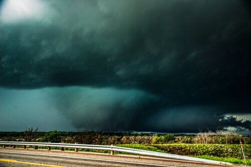 Tornadic supercell W of Quanah, TX. I sat in this spot about 10 minutes and a large tornado developed to the left between the inflow band and the area of precipitation. I originally thought this to be a different tornado than the Elmer, OK EF-3, but later confirmed to be on the ground for nearly an hour so it was the start of that beastly long tracked tornado.