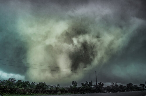 24mm photograph looking SW from the Red River as the strong tornado is crossing the Red River for its second time back into Oklahoma. The roar was incredible here. Likely a combination of the intense/violent tornado and the huge hail coming from my SW in the RFD core.