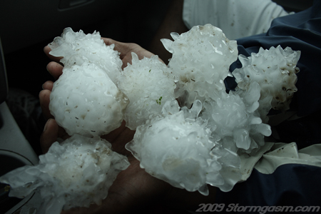 Above: Close up of hailstone (melted) collected west of Maysville, MO - Hail over 4" was found earlier near Oregon, MO.