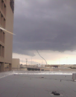 I shot up to the 5th floor of our hospital and immediately saw the tornado. It was a dramatic sight since I'd never ever thought I'd see one here. The T/Td spreads were perfect giving the storm base a relative higher height than is often seen here. There was a perfect cylindrical tornado easy to spot about 10 miles to my west and moving northward at about 5-10mph. I tried to capture images w/ my cell phone, but the distance focus on this thing sucks, so you'll have to trust me when I tell you what it looked like from here. Fortunately, lots of other folks were in much better positions to capture the tornado, and I share their photos here.