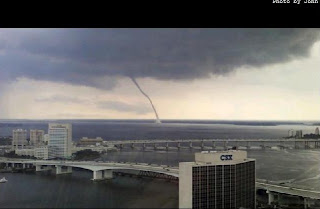 This led to the most visually dramatic portion of the storm which is captured best in the next two photos from Downtown JAX. The first was again anonymous from WJXT. The second photo was sent to me from one of my friends, Dr. Matt Geraci, from Baptist Hospital in Downtown JAX. Unfortunately, since the tornado was at this point over the St. John's River, it was called a waterspout by all popular media and I disagree since I believe this was in fact a true mesocyclone tornado with some non-MST features (weak circulation aloft but with highly visible structure consistent with a typical MST).